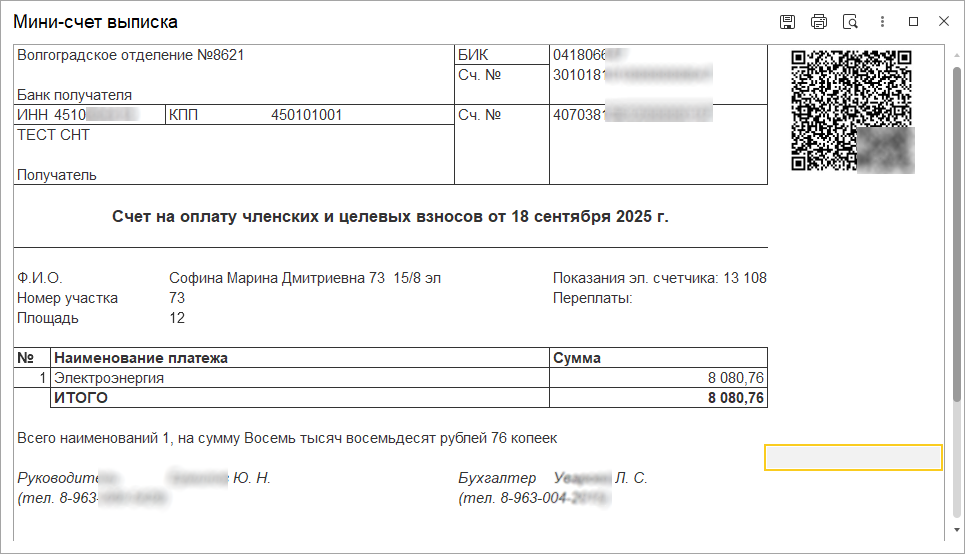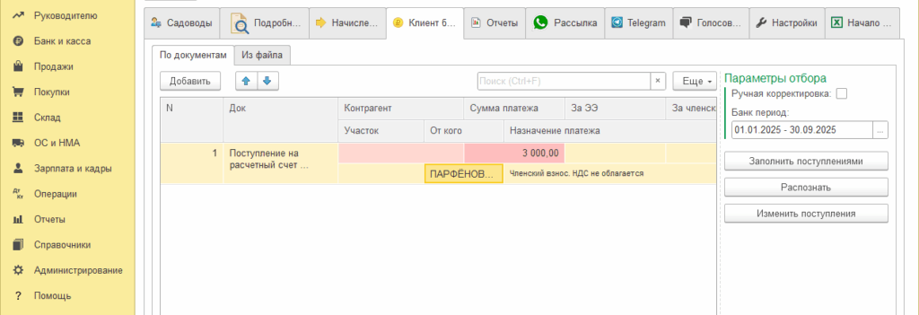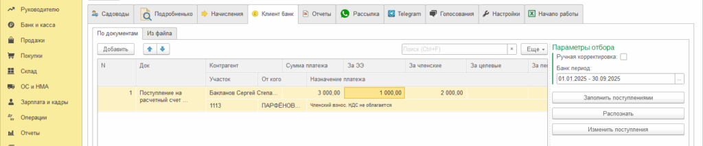 Нажав на «Распознать», программа попытается определить садовода (не всегда платит сам хозяин) и назначение платежа. В случае оплаты по qr коду из созданного вами мини-счета, назначение платежа станет машиночитаемым. Например — /»участок»;»67″,»элек»;1000,»член»;2000,»целе»;0,»допу»;0,»пени»;0/. В этом случае, контрагент подставится по участку 67 и заполнятся платежи за электричество (1000 р.) и членские взносы (2000 р.). Если назначение платежа не машиночитаемое, то ИИ попытается распознать участок и цель платежа. Все несостыковки (не найден садовод или общая сумма платежа не равна сумме по колонкам назначения) будут подсвечиваться красным. Программа не сможет создать проводки до тех пор, пока ошибки не будут исправлены.