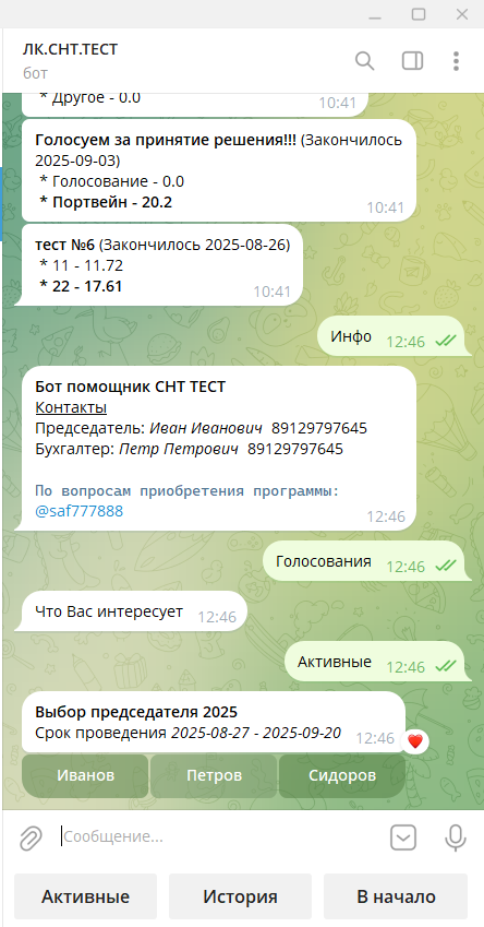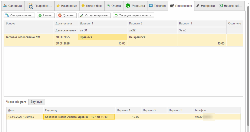 Здесь можно создать, удалить или отредактировать новый опрос. Согласно ФЗ хх.зз, результаты голосования прямо пропорциональны кол-ву акров садоводов. Проголосовать можно ЛК телеграм, или ручную, на основании заполненного бюллетеня.