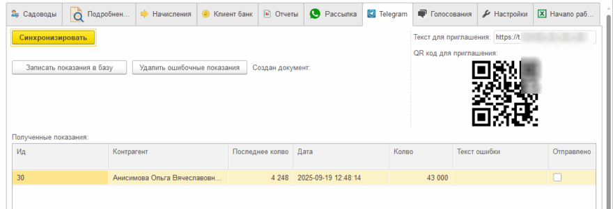 Все принятые показания отобразятся в таблице «Полученные показания». Нажимаем «Записать показания в базу». Создастся документ