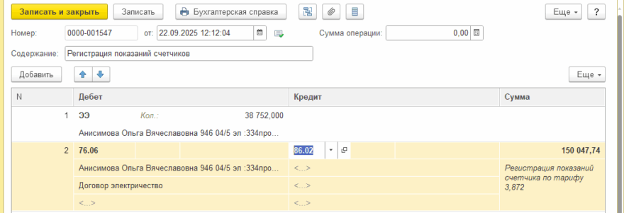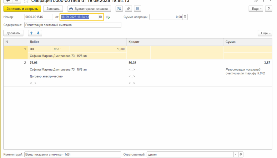 Справа отобразится его долги/переплаты и последнее веденное в систему показание счетчика. Далее введите в поле «Прием показаний» новое значение и нажмите «Принять». Система автоматически рассчитает кол-во новых кВт и их стоимость, согласно курсу «валюты ЭЭ». Откроется созданный документ.