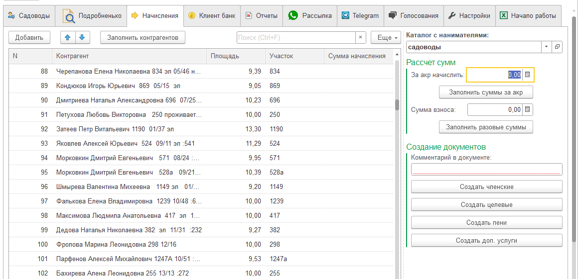 Возможно заполнить список садоводов для начисления кнопкой «Заполнить контрагентами». В этом случае в списке окажутся все садоводы. Либо выбрать жертв вручную. Возможны начисления по: