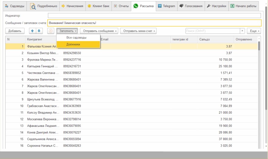1С:Яблоня позволяет осуществить всем/выбранным/должникам садоводам рассылку текстового сообщения или счетов на оплату.