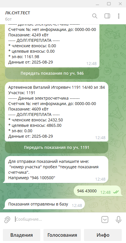 Особенностью работы мессенджера является то, что нельзя сделать рассылку по номеру телефона, как whatsapp. Требуется специальный телеграм_ID пользователя. Таким образом, что-то написать или отправить счет садоводу можно только после того, как он сам зарегистрируется в боте.